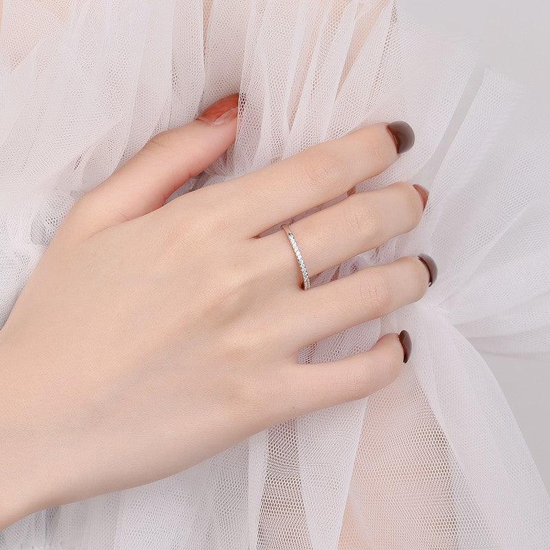 The Ethereal Gleam Band combines luminous sterling silver with a continuous row of micro-pavé stones that capture light from every angle. Designed for refined elegance and lasting shine, this ring delivers timeless sophistication and modern minimalism in perfect harmony.