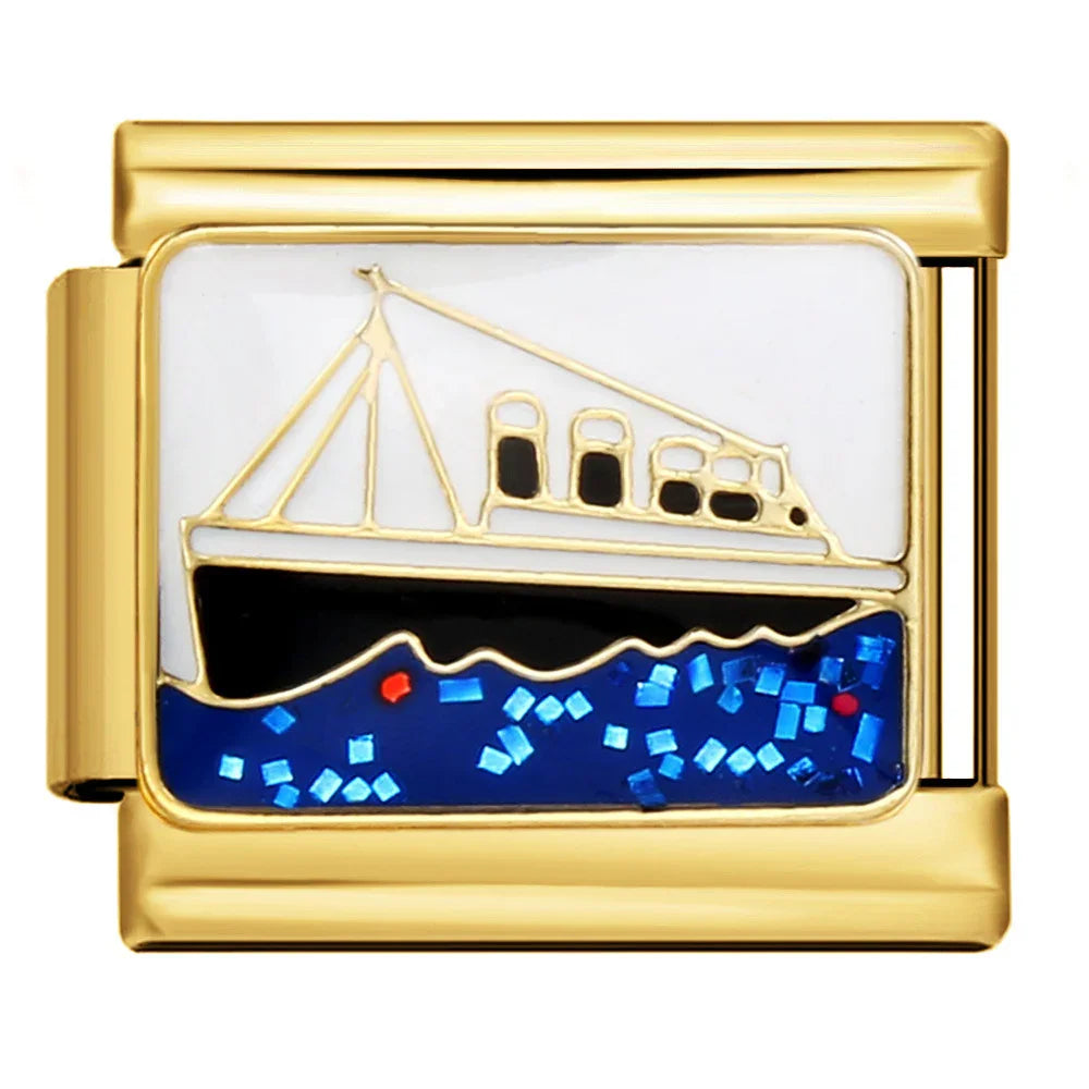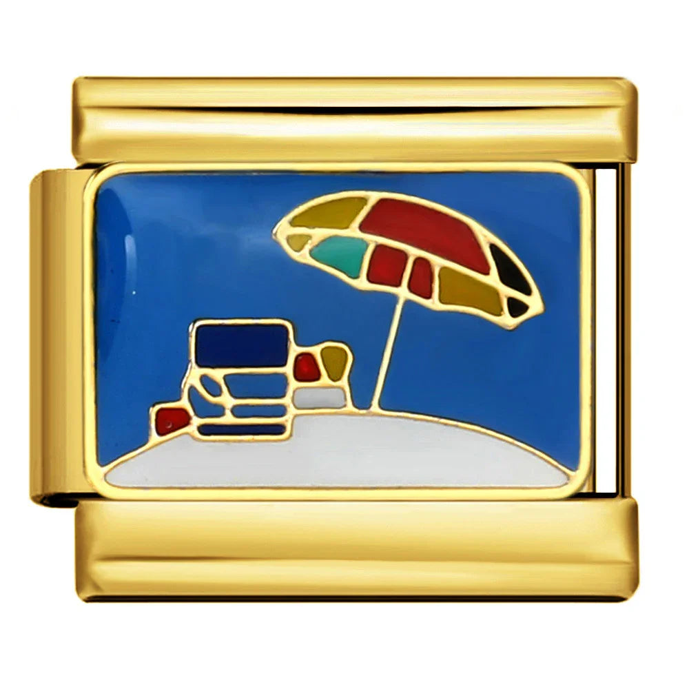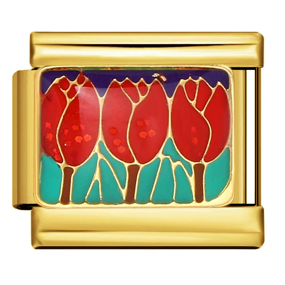 A refined modular bracelet featuring 16 interchangeable gold-tone enamel links. Vivid cloisonné motifs, smooth glossy finish, and secure side-rail connection let you personalize your look with travel, floral, and iconic designs for everyday elegance.