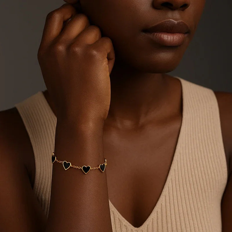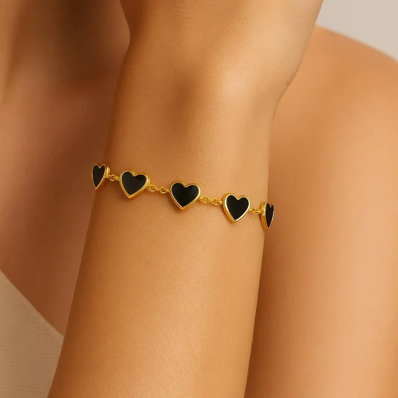 Designed to stand out subtly, the Heart Glow Bracelet features a sleek row of black enamel hearts framed in polished gold. Its minimalist silhouette makes it the perfect accessory for effortless sophistication and refined everyday style.