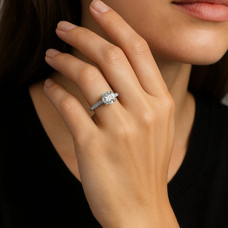 The classic solitaire silhouette pairs with any wardrobe. Pavé shoulders add modern brilliance, making it equally suited for engagements, anniversaries, or everyday sophistication.
